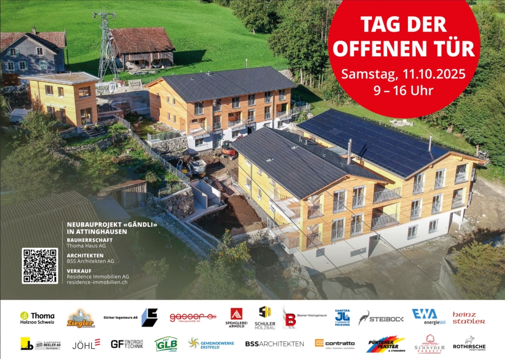Am Samstag 11.10.25 findet ein Tag der offenen Tür der Wohnüberbauung Gändli Attinghausen statt. Die beteiligten Unternehmen werden sich an einer Tischmesse präsentieren. Wir freuen uns sie dort zu begrüssen und freuen uns auf einen interessanten Tag.